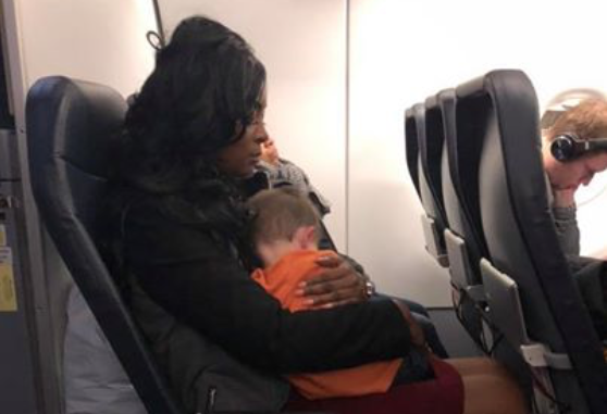 Posting a photo of the stranger cuddling her son on Facebook, the thankful mum wrote: “So I thought it was a good idea to fly by myself with a 2 yr old and a 5 year old.