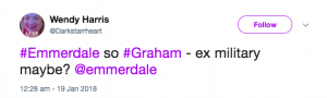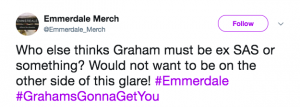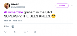 “#Emmerdale. graham is the SAS SUPERSPY. THE BESS KNEES,” added another.