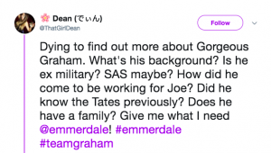 One commented: “Dying to find out more about Gorgeous Graham. What’s his background? Is he ex military? SAS maybe? How did he come to be working for Joe? Did he know the Tates previously? Does he have a family? Give me what I need @emmerdale! #Emmerdale #teamgraham.”