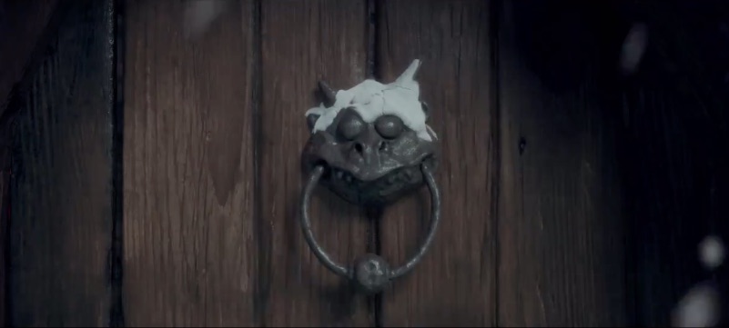 With snow falling, the gargoyle-type knocker soon gives way and the door opens.