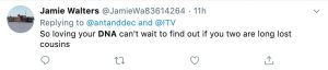 A third wrote: “So is there going to be a big reveal at the end of #AntAndDecsDNAJourney part two tonight? Are they related to each other?”