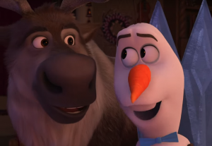 Olaf the snowman rearranges himself during a game of charades to act out decorating the tree and snowballs before Elsa uses her magical powers to bring them all together for a Christmas feast.