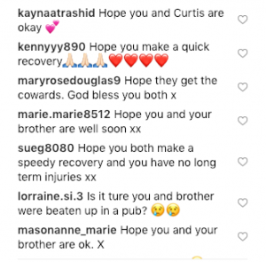 A third commented: “I hope you and your brother are recovering, it is shocking how jealous people behave. My thoughts are with you and your brother and family xx.”