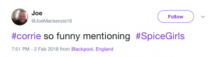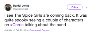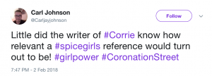 Viewers are convinced that Coronation Street writers must have a sixth sense after a number of timely references were made to the 90s girl band in tonight’s visit to the cobbles.