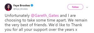 The soap star, who plays Kate Connor in the ITV show, tweeted: “Unfortunately Gareth and I are choosing to take some time apart. We remain the very best of friends. We’d like to thank you for all your support over the years x.”