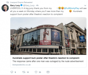 “@FullMontyPlay will see all you a week on Monday where you’ll see more than my [bleep] (sic)”