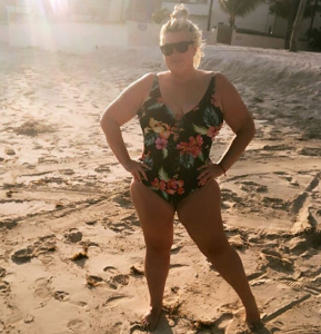 In the video, the former TOWIE star is seen doing a cartwheel on the sand while showing off her weight loss in a black patterned swimsuit.