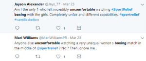 One said: “People saying they were uncomfortable with the female boxing on sports relief last night… Jeeze get a grip they were trained, they were fully informed, they were good. You can’t march for equality then say ‘girls shouldn’t do that’.”