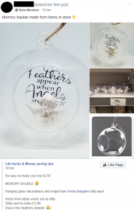 A photo was shared to the Home Bargains Appreciation Society Facebook page showing a glass bauble featuring a message and feathers inside.
