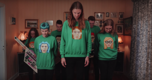 The band all wear green jumpers with pixellated faces on the front and cut some stiff shapes.