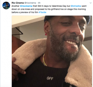 “Still five days to go to Valentine’s Day,” read the post, “but @idriselba got down on one knee and proposed to his girlfriend live on stage this morning before a preview of his film #Yardie.”