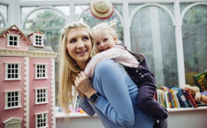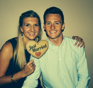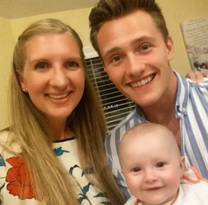 The caption was beside a picture of them both swinging their two-year-old while on a dog walk.