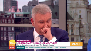 Glancing off camera at the broadcaster, Julian stopped talking about his latest book to remark: “I’m trying to talk while Eamonn is coughing away.”