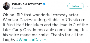 Producer Jonathan Sothcott wrote: “Oh no! RIP that wonderful comedy actor Windsor Davies: unforgettable in 70s sitcom It Ain’t Half Hot Mum and the lead in 2 of the later Carry Ons.