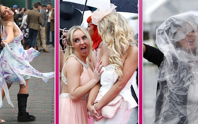 Many predicted April showers as there was a lot of weather-appropriate gear and even matching umbrellas on display, although some not-so-savvy race-goers were left with plastic capes for rain protection – with one lady even bundling hers over her head.