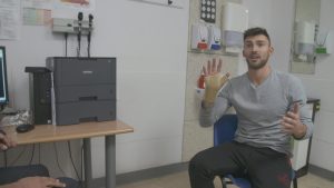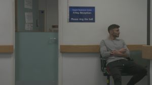 Further pictures released by ITV show him nervously waiting the results of his scans, before looking relieved with a support on his hand.