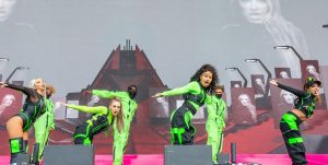 Sporting a black and green leotard, which was unzipped to show a PVC bra, Jesy didn’t hold back as she let loose while the band sang their hit track, Touch.