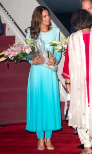 Kate again opted for traditional dress, wearing a blue kurta and scarf by local designer Maheen Khan.