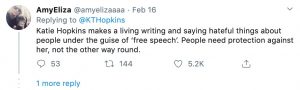 “Katie Hopkins makes a living writing and saying hateful things about people under the disguise of ‘free speech’. People need protection against her, not the other way around,” one wrote.