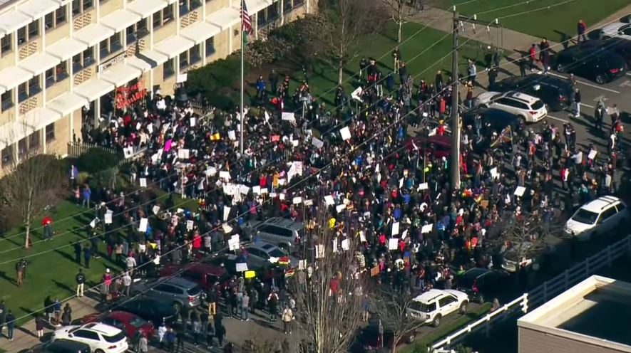 Children at the school reportedly staged a mass walkout not long after hearing the pair had stepped down from their posts – sitting in and blocking the school’s corridors before proceeding to occupy the building’s front lawn, in dramatic scenes captured by news organisation King 5.