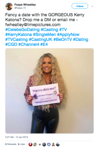 According to The Mirror, Celebs Go Dating bosses are eager to help Kerry out. They’ve reportedly launched a public appeal to help find Mr Right and get him on the show.