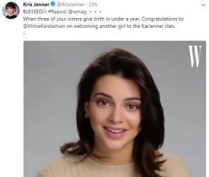 Kris revealed the happy news on Twitter, reposting a video of Kendall Jenner with the caption, “BLESSED! Repost @Wmag When three of your sisters give birth in under a year. Congratulations @KhloeKardshian for welcoming another girl to the KarJenner clan.”