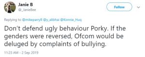 But one viewer told him: “Don’t defend ugly behaviour, Porky. If the genders were reversed, Ofcom would be deluged by complaints of bullying.”