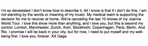 “I love this show more than anything, and I love you, but this is beyond my control, London, Manchester, Zurich, Koln, Stockholm, Copenhagen, Paris, Berlin. And Rio.