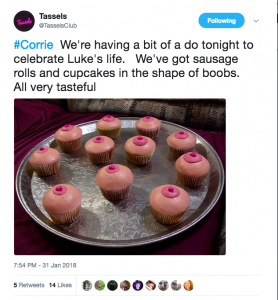 Anything’s fair game to @TasselsClub. Even Luke’s funeral was mentioned when they posted a pic of some cupcakes in the shape of boobs, saying they were “having a bit of a do tonight to celebrate Luke’s life”!