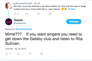 A viewer who said one of the dancers looked like a mime artist was told: “If you want singers you need to get down the Gatsby club and listen to Rita Sullivan.”