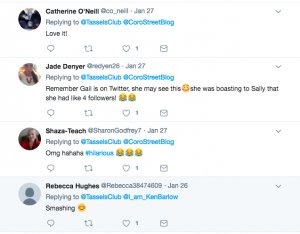 It’s not the only spoof Twitter account linked with Corrie. @Weatherfield999 is also popular with fans – especially now the Weatherfield Police have got so much to do, thanks to Phelan’s murder-spree!