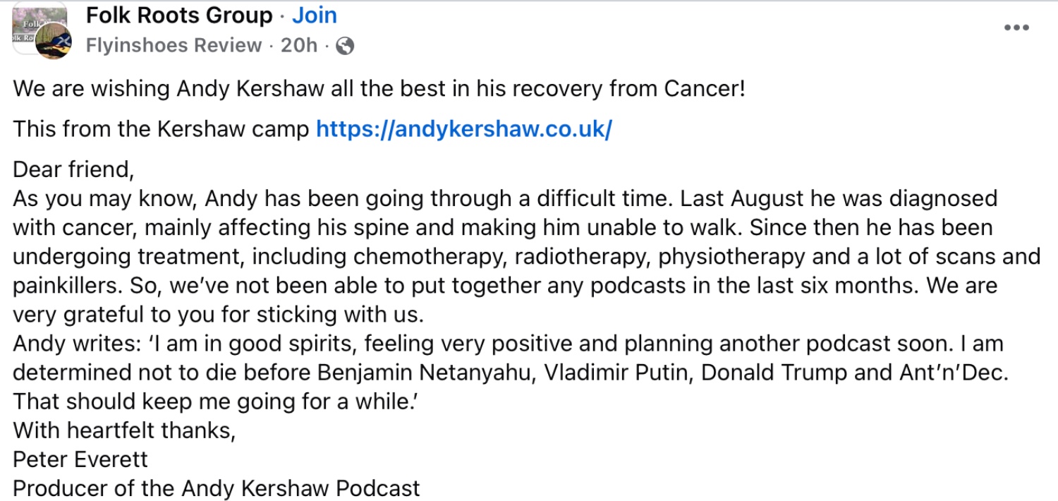 The Folk Roots Group also shared the news on Facebook with its members and added: “We are wishing Andy Kershaw all the best in his recovery from cancer!”