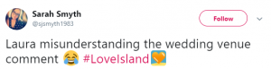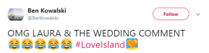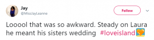 One person said: “OMG LAURA & THE WEDDING COMMENT,” while another tweeted: “That was so awkward. Steady on Laura he meant his sisters wedding.”