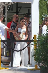 Wearing a white crop top and matching skirt, Michelle looked gorgeous, while Mark teamed a white tee with navy shorts.