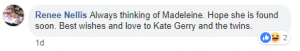 Another, in Glasgow, commented: “Always thinking of Madeleine. Hope she is found soon. Best wishes and love to Kate Gerry and the twins.”
