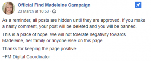 “This is a place of hope. We will not tolerate negativity towards Madeleine, her family or anyone else on this page.”