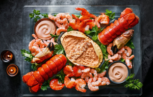Included in the platter is 2 Atlantic lobster tails, Atlantic dressed crab and claws, Vietnamese black tiger prawns and peeled Honduran king prawns.