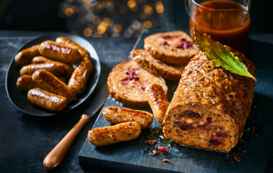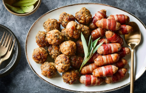 The selection includes 16 outdoor-bred pork cocktail sausages, wrapped in bacon and 16 pork, sage and onion stuffing balls.