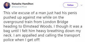 She wrote: “This vile excuse of a man just had his penis pushed up against me while on the overground train from London Bridge heading to Elmstead Woods.
