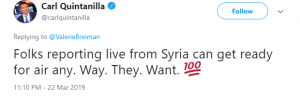But another NBC anchor, Carl Quintanilla, hit the nail on the head when he tweeted: “Folks reporting live from Syria can get ready for air any. Way. They. Want.”