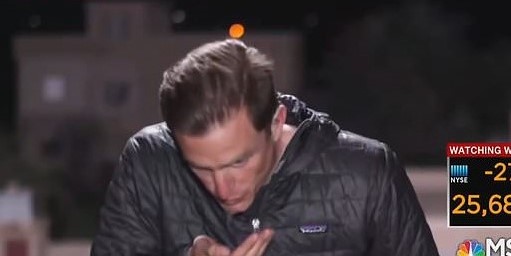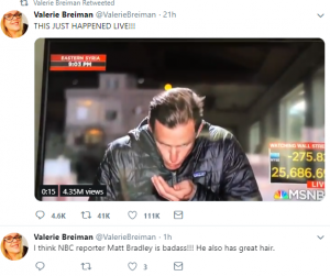 “THIS JUST HAPPENED LIVE!” cried the original poster sharing the clip. She later tweeted: “I think NBC reporter Matt Bradley is badass!!! He also has great hair.”