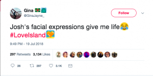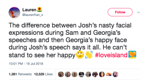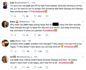 One viewer tweeted: “I’m 100% not here for Josh’s faces every time Georgia speaks or does something, you’ve moved on with Kaz, what is your issue ? #loveisland”.