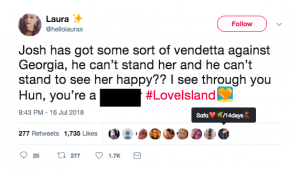 A third blasted him, saying: “Old josh actually irritates the [bleep] out of me, why’s he got such an issue with Georgia it’s weird, focus on your new girl #loveisland”.