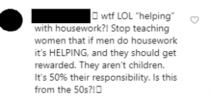 One person commented: “Stop teaching women that if men do housework it’s HELPING and they should get rewarded.
