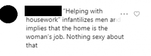 Another wrote: “Helping with housework’ infantilizes men and implies that the home is the woman’s job. Nothing sexy about that.”
