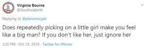 One told Piers: “Does repeatedly picking on a little girl make you feel like a big man? If you don’t like her, just ignore her.”