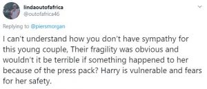 A fourth responded: “I can’t understand how you don’t have sympathy for this young couple, their fragility was obvious and wouldn’t it be terrible if something happened to her because of the press pack? Harry is vulnerable and fears for her safety.”