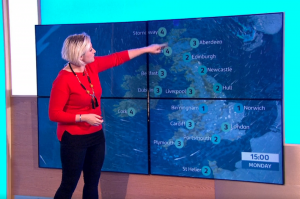 Despite not having the handheld ‘clicker’ controlling the weather images shown on her screen display in the studio, Becky’s blushes were saved by alert production staff.