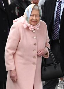 The monarch wore a salmon pink coat and patterned headscarf as she carried a black handbag.