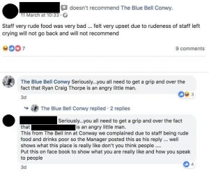 However, the customer hit back: “This from The Bell Inn at Conwy we complained due to staff being rude, food and drinks poor so the manager posted this as his reply.